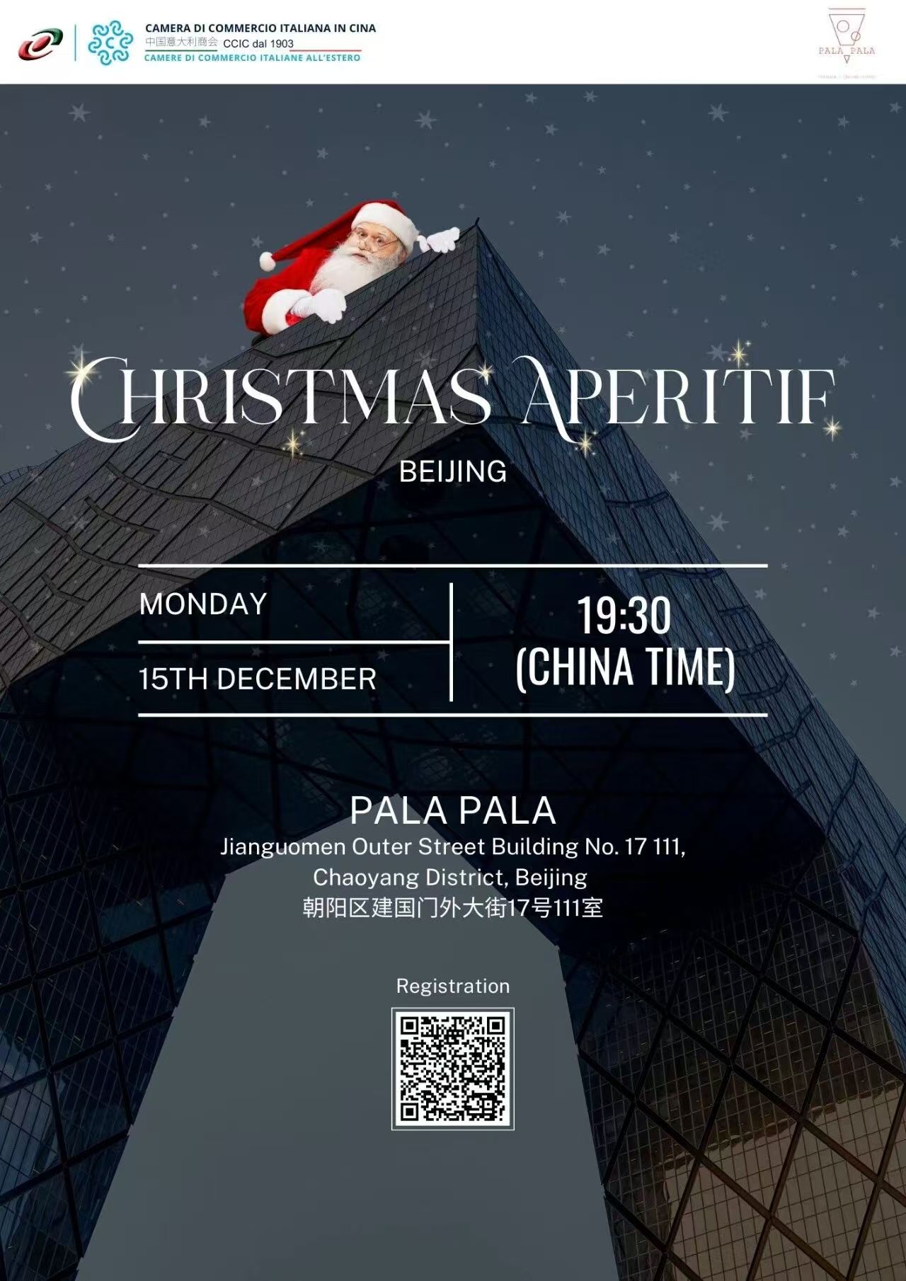 The China-Italy Chamber of Commerce is delighted to invite you to the Christmas Aperitif to be held on December 15th from 19:30 at Pala Pala Italian Restaurant in Beijing.