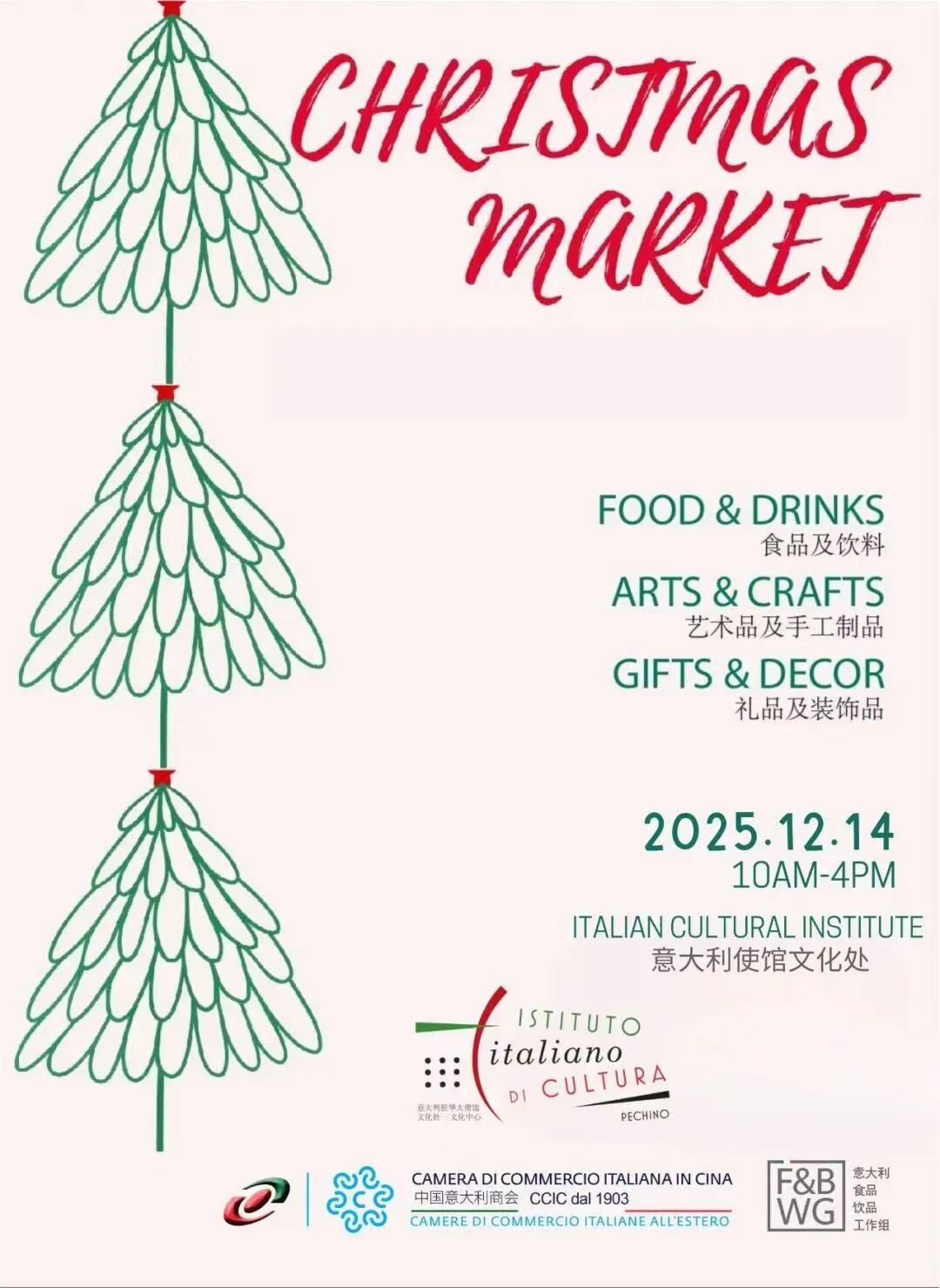 Il 14 dicembre dalle ore 10:00 alle 16:00, la Camera di Commercio Italiana in Cina, insieme al suo gruppo di lavoro del Food & Beverage, e l'Istituto Italiano di Cultura, vi invitano a partecipare a uno speciale mercatino natalizio negli spazi dell'Istituto.