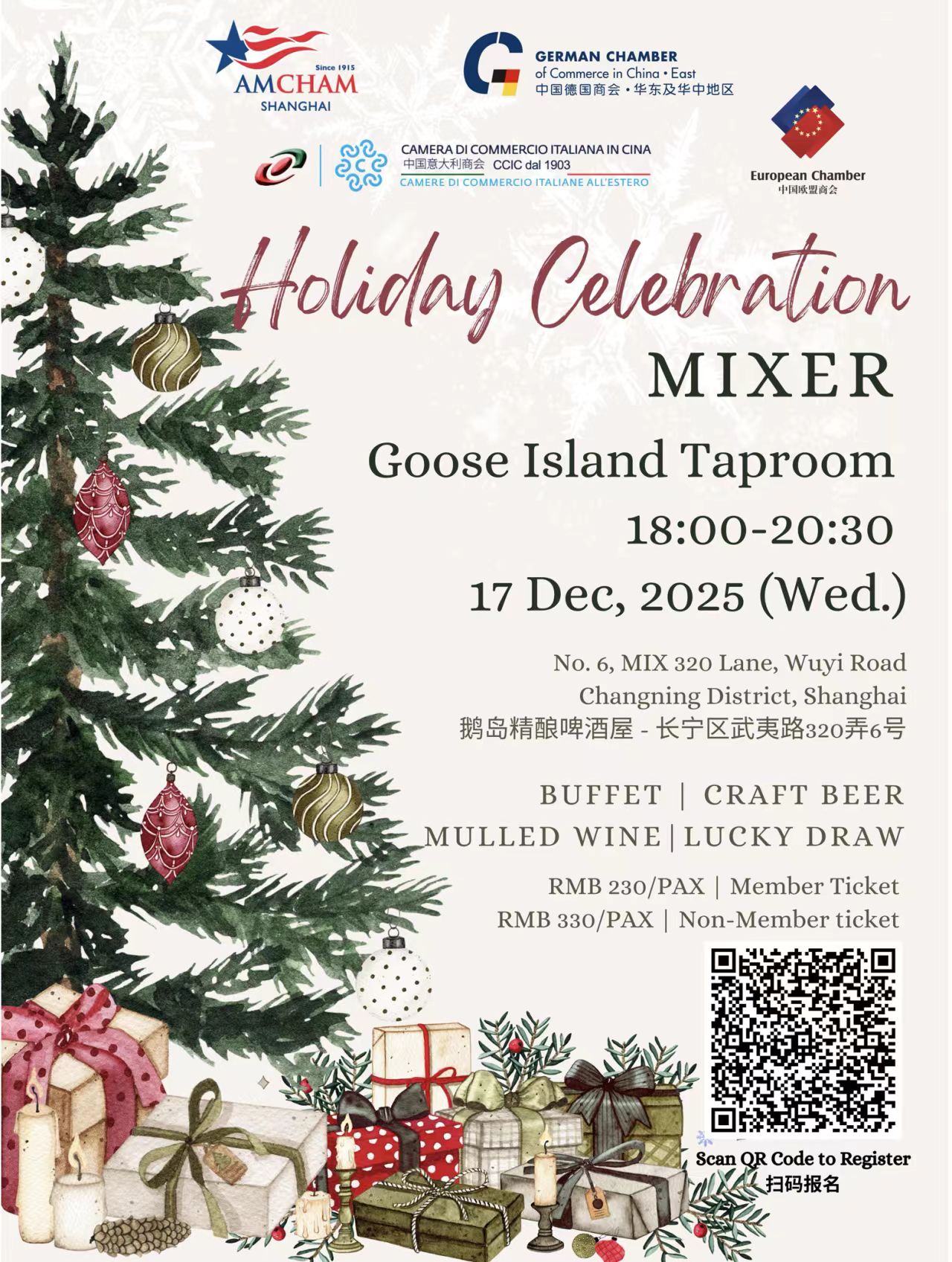 The China-Italy Chamber of Commerce (CICC) invites you to register for the Interchamber Holiday Celebration Mixer, jointly hosted alongside the American Chamber, the German Chamber, and the European Chamber of Commerce. The event will take place on Wednesday, December 17th, 2025, from 18:00 to 20:30 at Goose Island Taproom, Changning District, Shanghai.